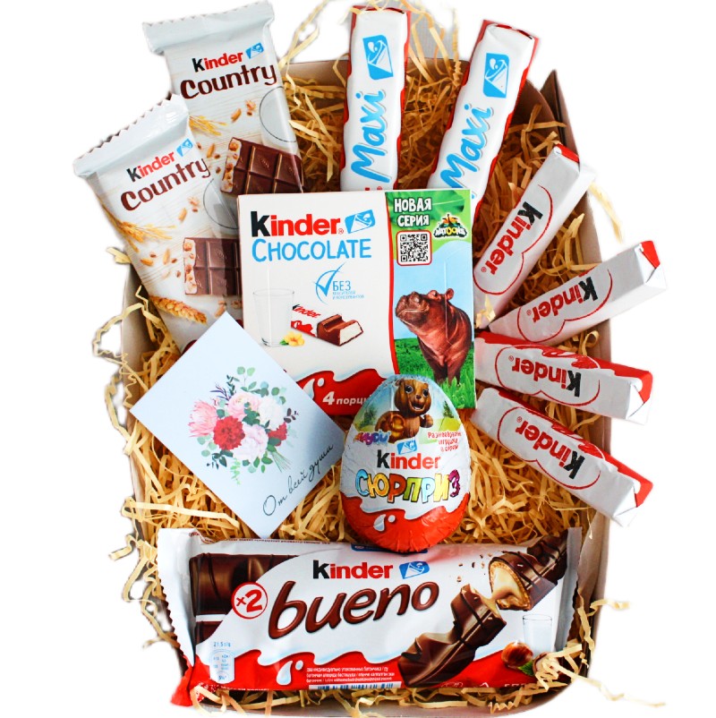 шоколадное яйцо с сюрпризом, молочный шоколад, два батончика Макси весом по 21 грамм каждый, два батончика молочного шоколада со злаками Кантри весом по 23,5 грамма каждый, две вафли Буэно суммарным весом 39 грамм. Kinder набор включает сладости: Kinder Chocolate 50 gr - 1 шт. Киндер шоколад - 4 шт. Kinder Maxi - 2 шт. Kinder Country - 2 шт. Kinder Surprise - 1 шт. Kinder Bueno - 1 шт.